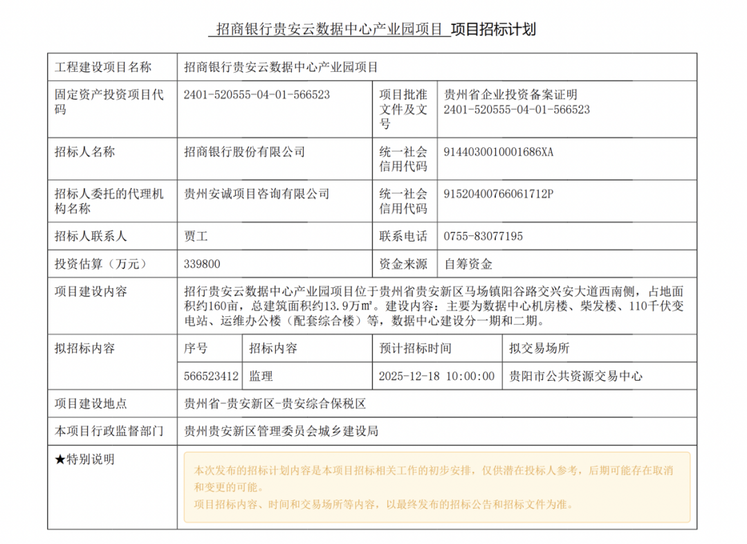 11月17日,招商银行股份有限公司发布《招商银行贵安云数据中心产业园项目》招标计划,该项目预算为339800万元。
