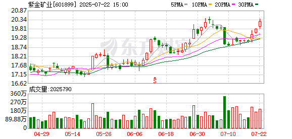 证券时报·数据宝统计显示,紫金矿业今日收盘价为20.25元,上涨2.32%,日换手率为0.98%,成交额为40.70亿元,全天主力资金净流入3.65亿元,近5日该股累计上涨5.91%,近5日资金合计净流入5.90亿元。